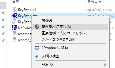 ダウンロードしたら"KeySwap.exe"を右クリック「管理者として実行」をクリックします。