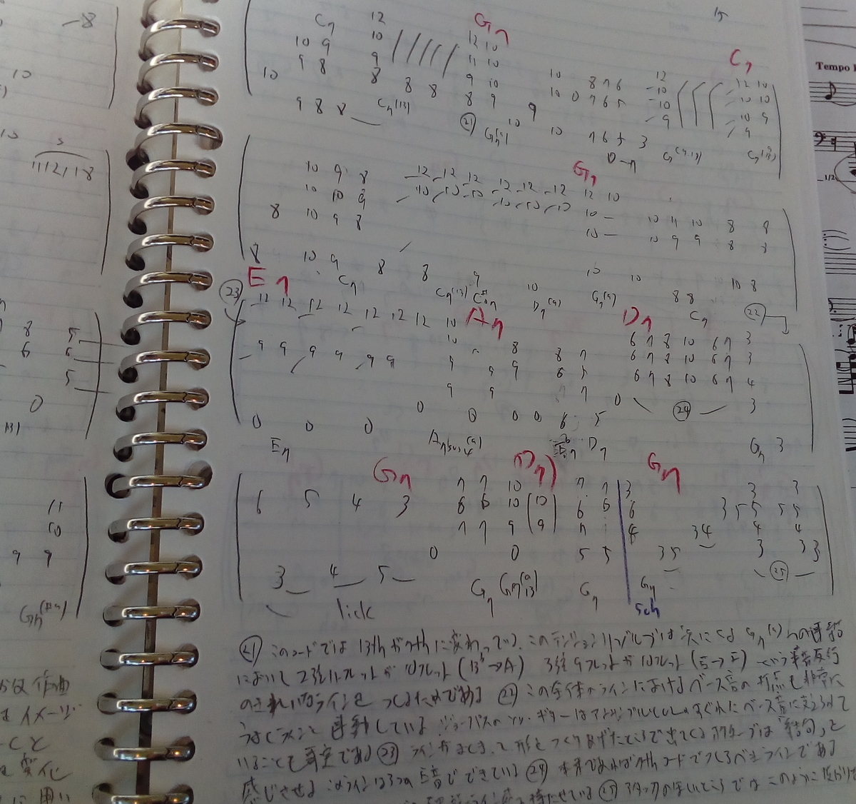 耳コピはほとんど経験と勘で進めます。全部完璧に聞き取るのではなく、こうかな?と聞き取った音を楽器で弾いてみたりして「だいたい」でどんどん進めます。