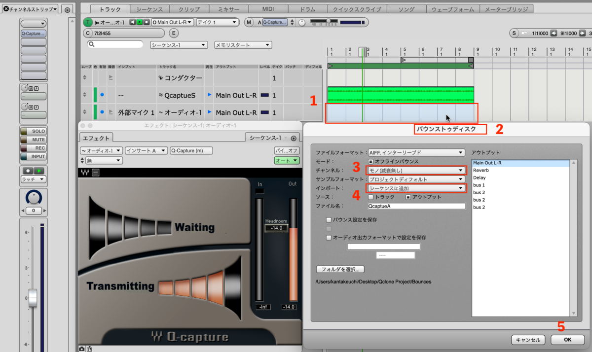 Q-captureは一度に一つしか使えず、Digital Performerではフィードバックループが作れなかったためこのような方法を取りました。