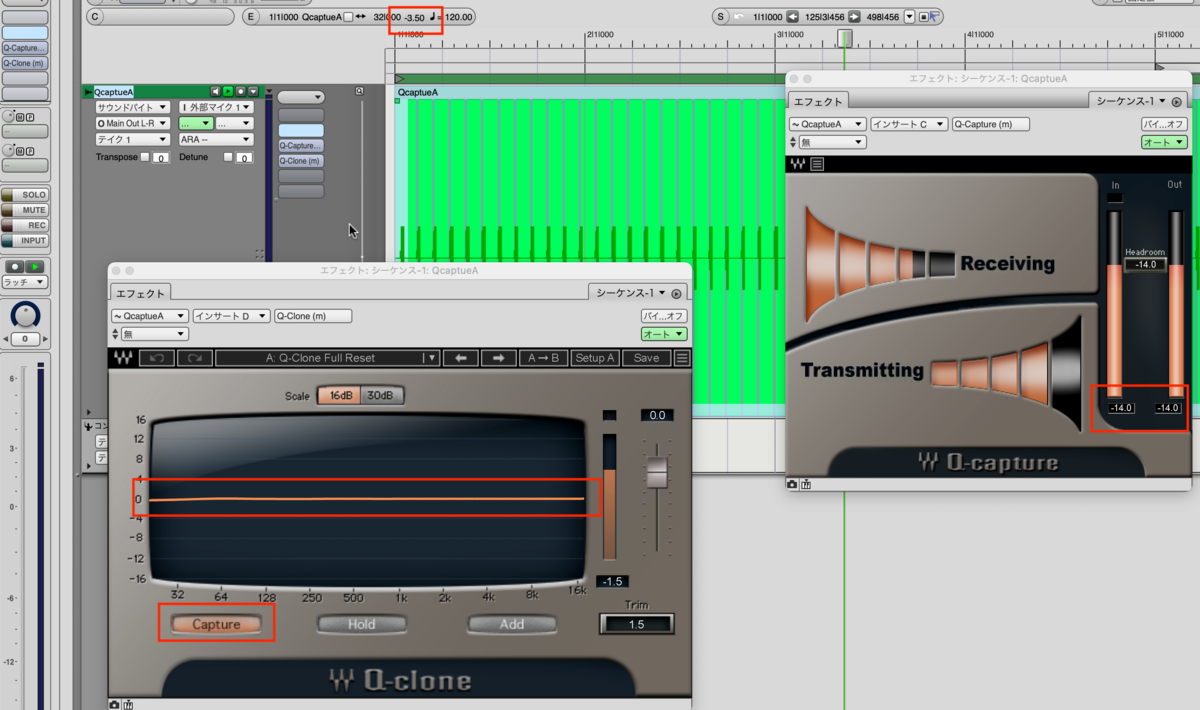 下記では-3.5のバイトボリュームにしてQ-capture画面の入出力が-14で統一されています。