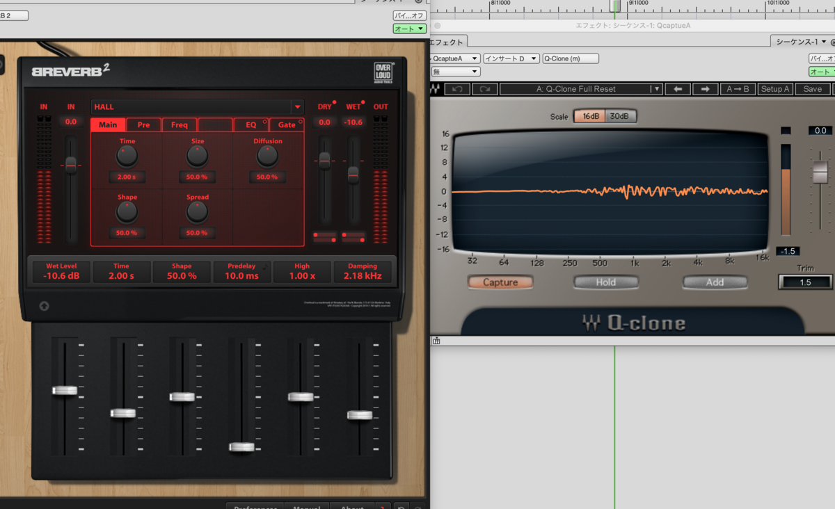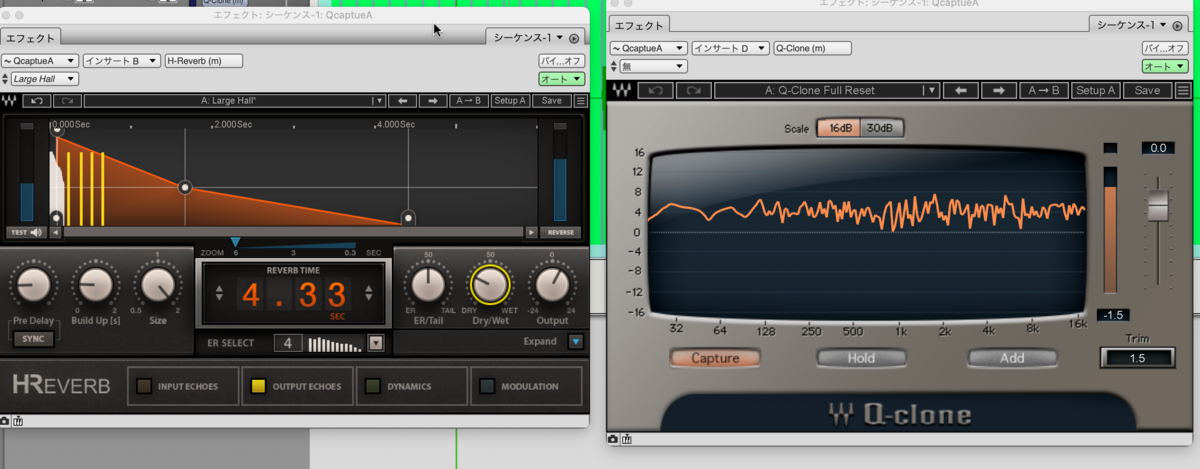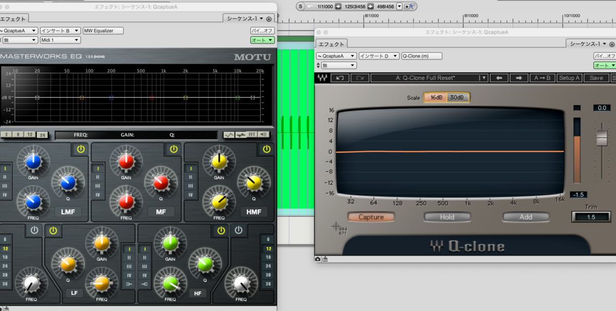 このやり方だと実際に曲に挿しながら確認することができないので、あくまで波形がどんなふうに変化するかを確認するだけにとどめます。q-captureトラックを曲データの中に作って、そこでQ-cloneの画面を見ながらみたいなこともできますが、かなりツワモノですね。