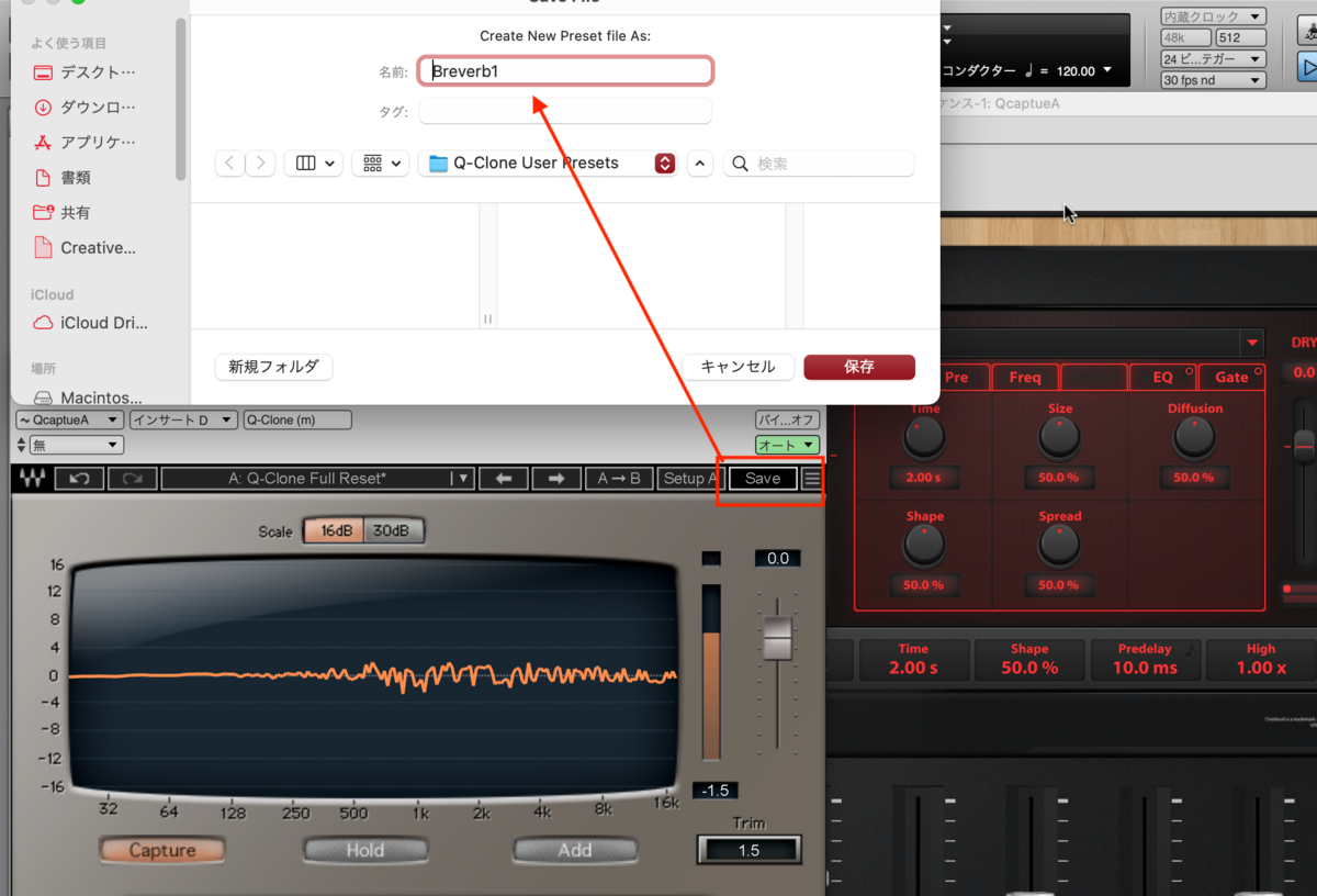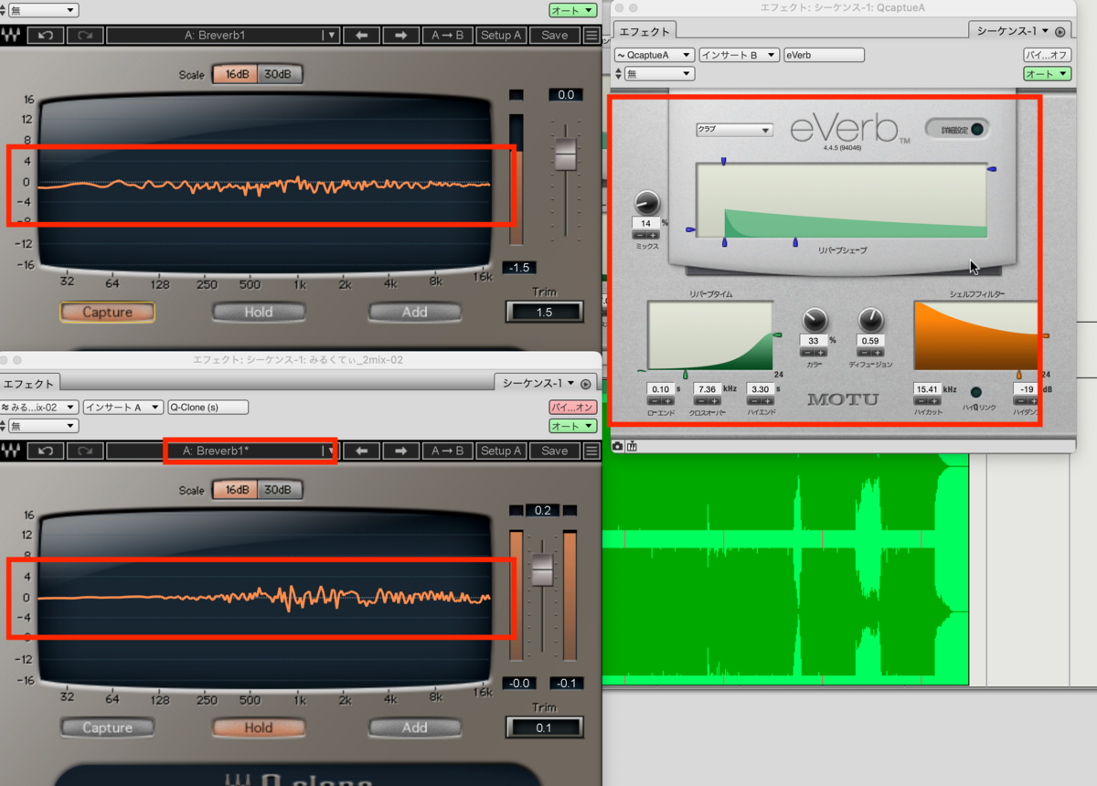 波形以外変容する要素がないEQのクローン作りはもちろんですが、例えば、Breverbの波形を保存しておいて、別のトラックでQ-cloneでBreverbの設定を読み出して使ったり、